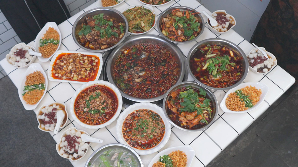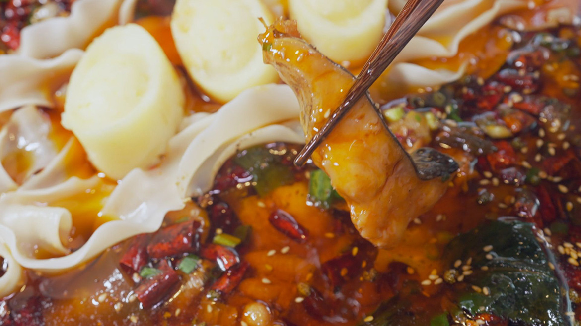 巫溪縣大寧河,據說兩千年前,運鹽的船工用河中的魚、岸邊的柴、船上的鹽、隨船的石板、罐中的泡菜,做出了屬於重慶的第一份烤魚。道地的烤魚,必得選用活魚,魚不可開膛破肚,而是順著脊背切開,留下軟軟的魚腹肉,使其一百八十度展開也能完整,炭火高溫逼出魚皮中的油脂,滴在炭上滋滋作響,醬料的加入,讓味道彼此融合,八分熟後,澆在烤好的魚上,滋啦一下,高溫激發了椒椒們的香氣,再淋到烤魚上,魚肉鮮甜,湯汁麻辣,素菜爽口,美味一口入魂。「熊掌豆腐」比普通豆腐更為細嫩,吸收味道的能力也是普通豆腐的加強版,先下魚,後下熊掌豆腐,魚和熊掌不僅兼得,還以食材的本味互相影響,麻香、鮮香、豆香、魚香,一口魚,一口熊掌豆腐,簡直絕配!「郵亭鯽魚」最大的特點是蘸料與盛具的不同,花生碎、榨菜碎、油酥豆和小蔥,盛在魚形的碗裡,待鯽魚上桌,舀一勺紅湯澆在蘸料魚碟中,夾起魚頭,讓它整條停在恰好的魚盤中,每夾起一塊魚肉都蘸一下佐料,既能吸飽佐料的味道,又能方便食客挑出小刺。來鳳魚,重慶特色名菜,在人人標榜正宗的市場下,第十四代傳人偏把最不正經當作行銷特色,專賣全重慶最不正經的來鳳魚,改用比花鰱魚品質更高的鉗魚,取童子魚那一段,猛火熱油,魚肉下鍋,一勺辣椒熱油潑向蔥、蒜、乾辣椒,將香味激發,再放入元寶形狀的馬鈴薯泥和過水寬麵,昇華滋味,美味就是這麼簡單。