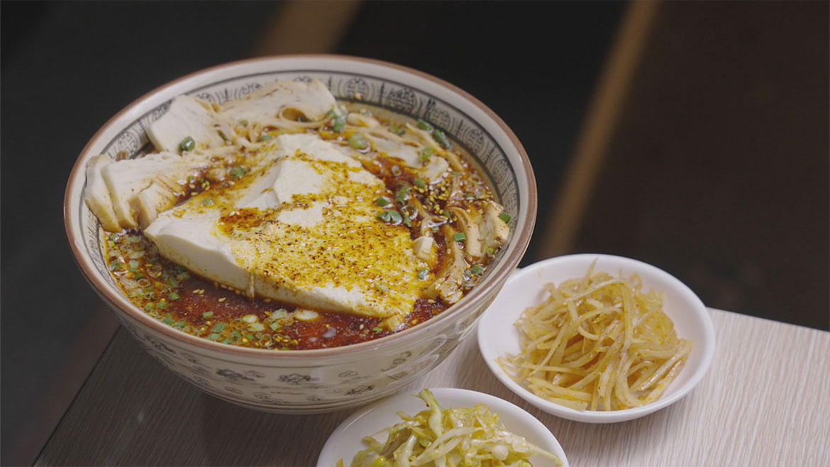 在西安,隨處可見聲色囂張的饃都大秀,打、烙、煮、冒、泡,奏響的是碳水不斷加倍的活色生香。切好的鍋盔入豆漿燙透後鋪入碗底,加入鹽和辣椒提味,蓋上豆花,澆上豆漿,再加上辣椒油增色,豆花鮮嫩爽滑,饃片軟香耐嚼,豆漿焦香濃郁,辣椒回味醇厚。老陝口中的坊上經典家常飯,「小炒」可不是炒菜,而是一碗重口的道地碳水美食,牛肉泡饃小炒,除了熟肉外,還有生肉,既有泡饃的濃郁厚重,還有酸辣爽口的獨到滋味,兩種口味在口腔內暴烈衝擊,這便是坊上的家常飯香味。老陝們將羊肉泡稱之為「水盆羊肉」,湯清肉爛,鮮嫩爽口,辣椒、小菜和羊肉一起夾入饃裡,吃著羊肉夾饃,喝著羊湯,洋溢出本香之味。「粉湯羊血」又稱為羊血泡,是二府街的傳統美食,吃起來像軟嫩的巧克力,粉絲打底,羊血切成火柴棒長條列入碗中,老豆腐經過蒸鍋的洗禮,排除水分後,切成薄片,更利於吸收湯汁,左手抓牢青花白碗,右手執勺澆入滾湯,迅速用勺柄遮掩住食材潷出湯汁,臘汁油和油潑辣子首當其衝,鹽和料粉來提味,香菜、小蔥進行點綴,最終一大勺熱湯澆灌其上,麻辣鹹香的羊血泡便大功告成 。