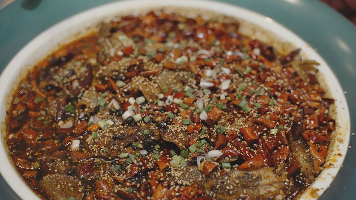 「羊雜碎」是綏德的招牌美食,山羊肚、羊血、粉條、芹菜、高麗菜是主要配料,最後必加一勺羊油辣椒,油潤鮮辣。「油旋」層層疊疊,片片成旋,焦脆酥香,豬頭肉是最佳拍檔,醬香加辛辣的雙重滿足,咬一大口,肉汁橫流,再喝口羊雜碎的鮮湯,便是老陝最愛的經典搭配。金身「葫蘆雞」名動古城,做完汗蒸的雞塗上麵糊,入油鍋後瞬間定形,反覆澆淋溫油,才能達到外酥裡嫩的口感,黃亮誘人,筷到骨脫。陝西人從小吃到大的「麵辣子」,將饃塊下入青花瓷的小盅內,上下翻拌,吮吸著醇厚的湯汁,釋放出辛香微辣的熱氣,既可以當菜,又可以當主食。漢中「熱米皮」香辣彈牙,搭配「花生漿」能緩和辣味,最後把豆腐加到熱米皮的醬汁裡蘸著吃,也是一種風味,在漢中當地的早餐,熱米皮和菜豆腐是常見的組合。陝南鎮巴味的「洋芋粑粑炒臘肉」,古法燻製更能凸顯肉的本香,臘肉汲取著紛呈的辣香,粑粑吸收了臘肉的油脂,飽滿晶瑩,醇香誘人,兩片洋芋粑粑夾一片臘肉吃,味道更好。出自漢江流域的黃辣丁,嫩嘟嘟的生命力十足,夥同配菜和香料下鍋後,再加入吊製好的奶白鯽魚高湯,魚肉吸足湯中的馥郁精華,在熱油的激發下,一口下去,鮮嫩多汁。