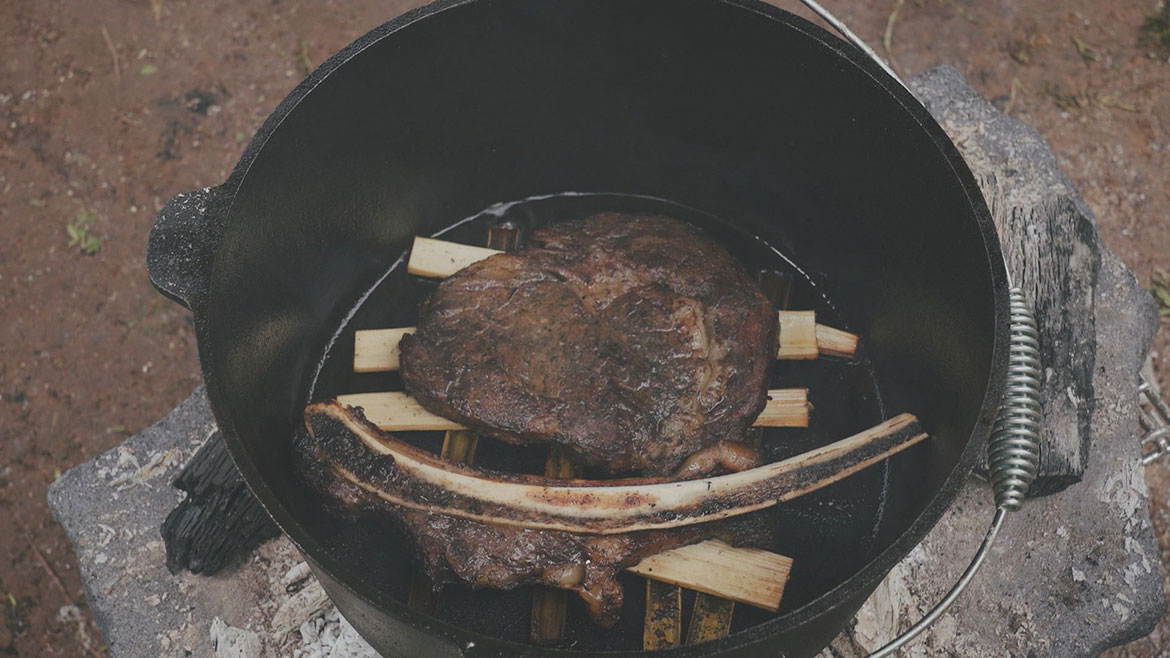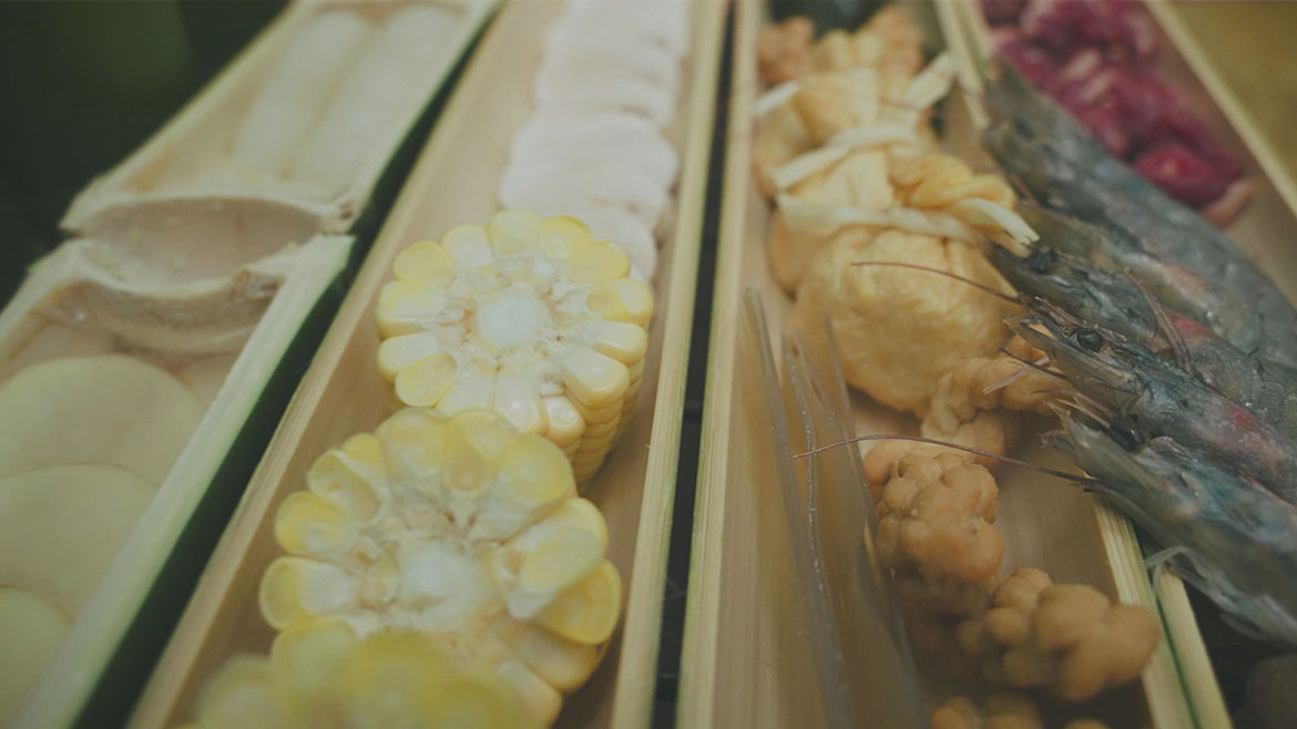 生長迅速的竹子,是今天的小驚喜,不同的火,可以做出不一樣的美食。一塊紋理、嫩度、彈性、肥瘦比例趨近於完美的戰斧牛排,就是今天的主角,將素面朝天的竹排擺成井字狀,拿到炭火邊待用,再給炭烤的牛排加點勁爆的料,讓它帶著熱烈的火焰,去與竹排相會,牛肉被裹上了焦香和蒜鮮,唇齒摩梭間,青椒的辣味慢慢浸入,再來一口骨排,黑胡椒的油汁在入口間迸發開來,還夾著淡淡竹香,再配上一口生蒜,更能充分激發出深層的肉香氣。如果說燒烤是食材與火焰的交鋒,那火鍋就是水火調和的食物藝術,沸水一入,紅油鍋底才算是大功告成。生脆的毛肚,只能在火鍋裡走個過場,須在七上八下之後,才是送入口的最佳時刻,這時的河蝦正當紅,咬掉蝦頭,料碗裡翻洋過海,肉質鮮嫩彈牙,簡直愛不釋口。坐在食材的原產地享用竹筍,確實是滿滿的新鮮滋味。